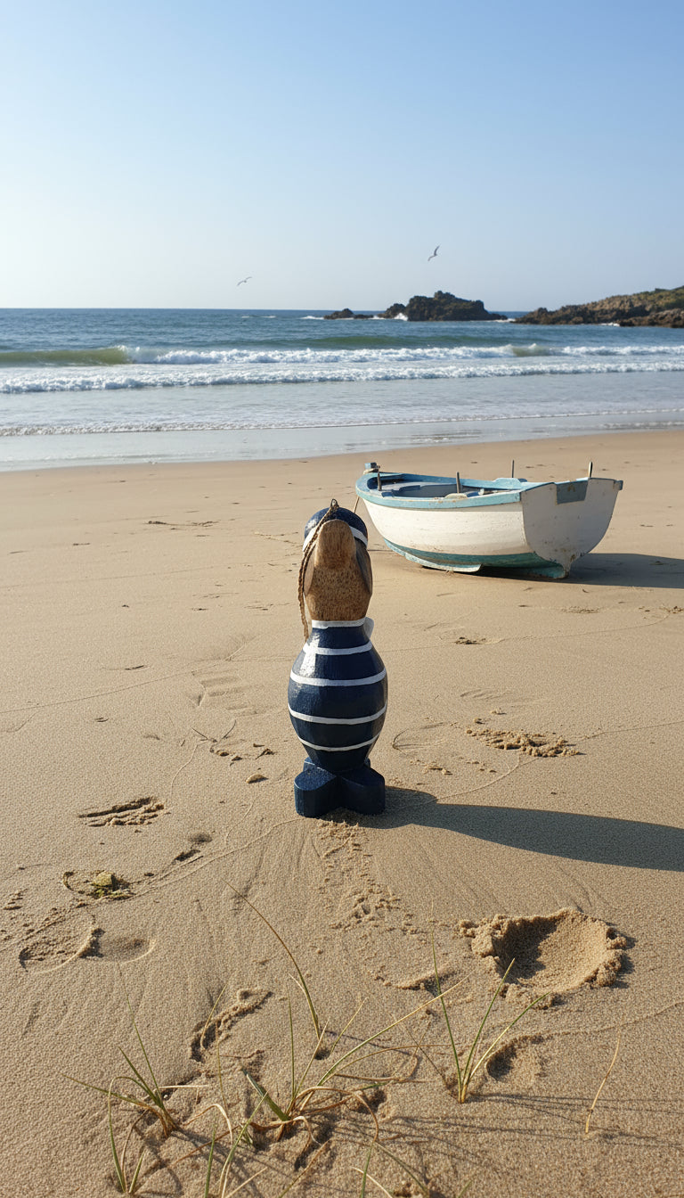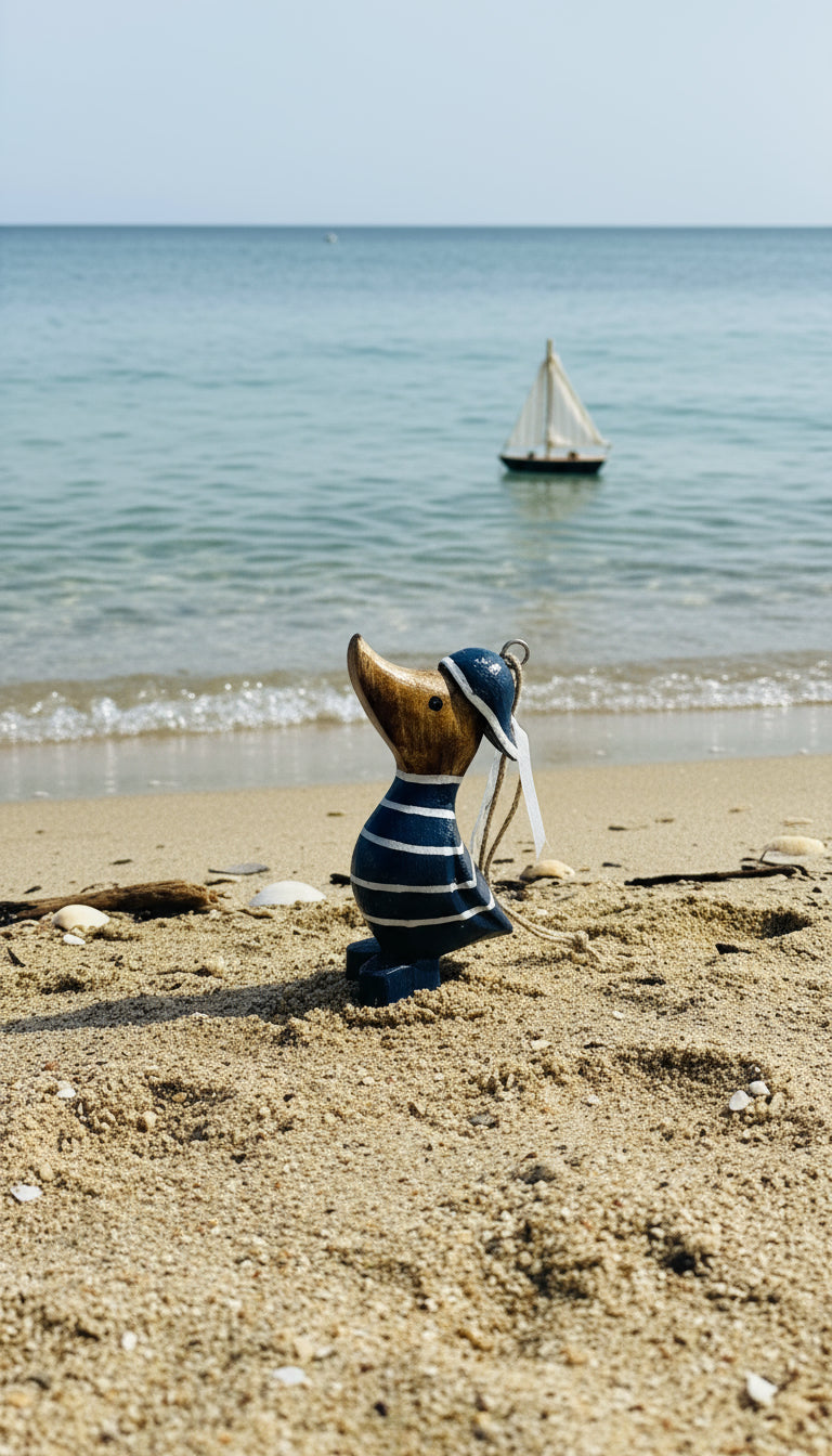 Adorable petit canard de 11 cm vêtu d'une marinière classique, parfait pour ajouter une touche de charme nautique à votre décoration. Confectionné avec soin, créant un objet artisanal plein de caractère. Idéal comme cadeau mignon ou comme élément de décoration côtière pour votre intérieur. Un compagnon de collection qui ravira les amateurs de style marin et de pièces décoratives authentiques.